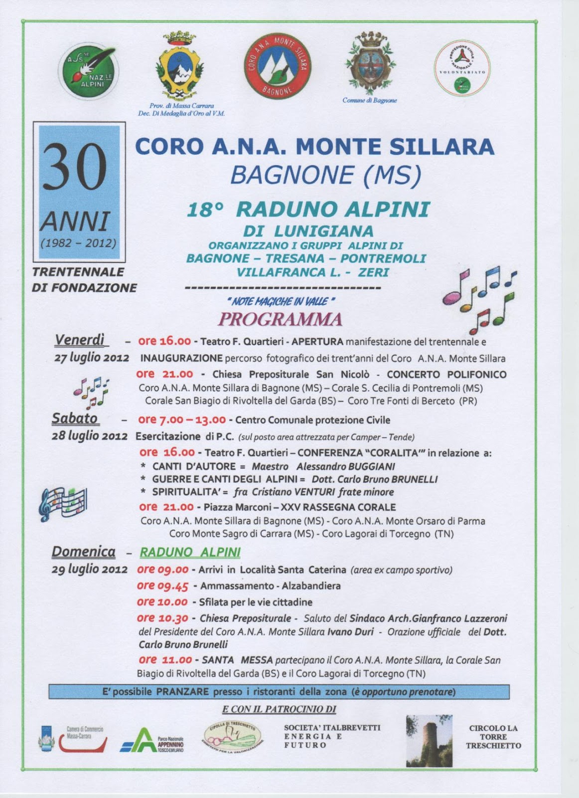 Tutto pronto a Bagnone per le celebrazioni del trentennale della costituzione del Coro Ana Monte Sillara. Nell'ultimo fine settimana del mese di luglio è in programma una "tre giorni" di canti, festa, riflessioni ed impegno civico. Infatti, oltre alla ricorrenza del coro sezionale della Spezia, gli alpini di Bagnone e l'amministrazione comunale hanno organizzato un'esercitazione di protezione civile che si svolgerà sabato mattina 28 luglio. Il giorno successivo, domenica 29 luglio, si terrà il 18° raduno dei gruppi alpini della Lunigiana, che concluderà i festeggiamenti del Coro Ana Monte Sillara, che si apriranno venerdì 27 luglio alle ore 16 a Bagnone presso il teatro Quartieri.