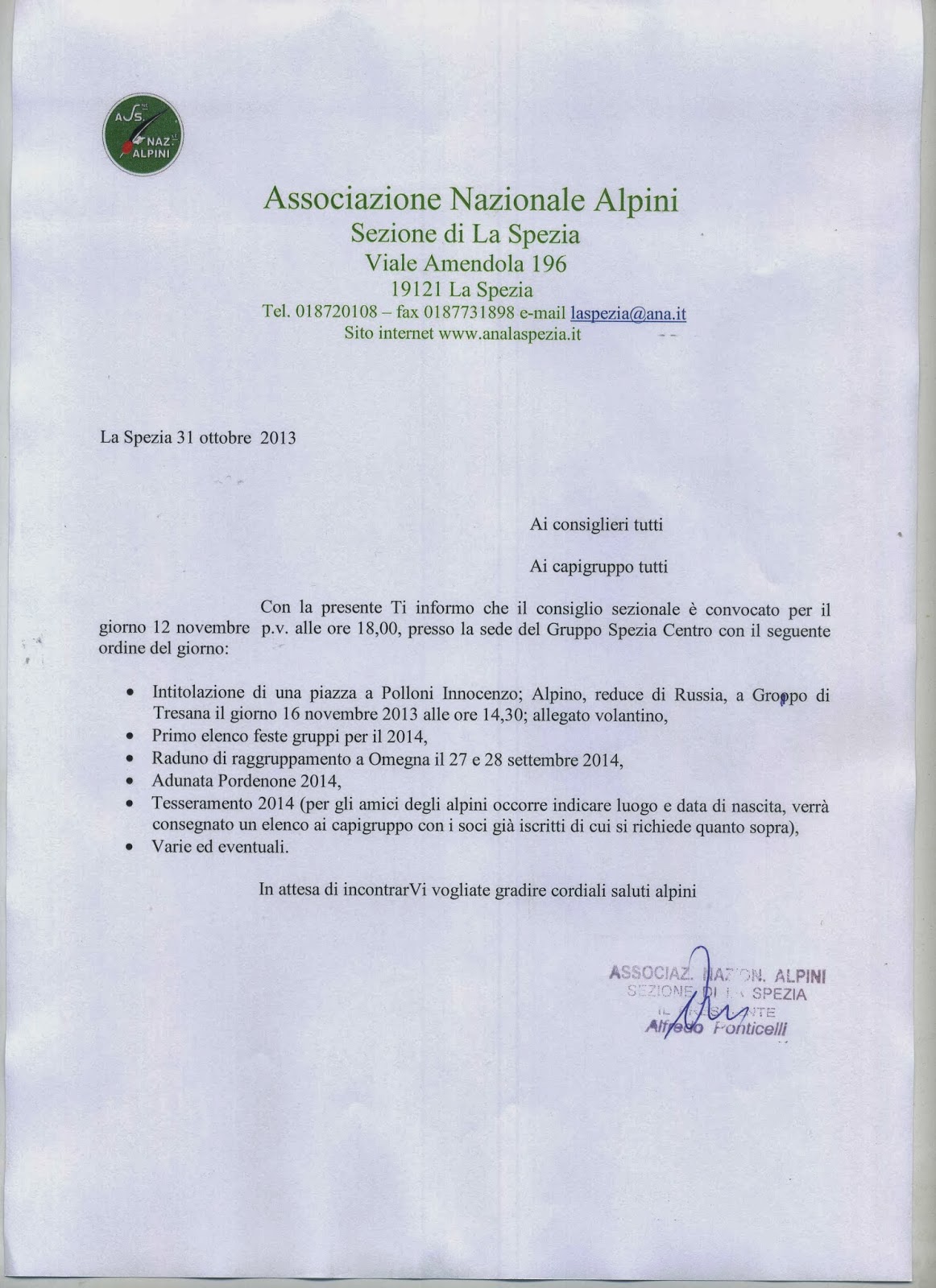 Il presidente Alfredo Ponticelli informa che il consiglio sezionale è convocato per il giorno 12 novembre 2013 alle ore 18,00 presso la sede del Gruppo Spezia Centro.