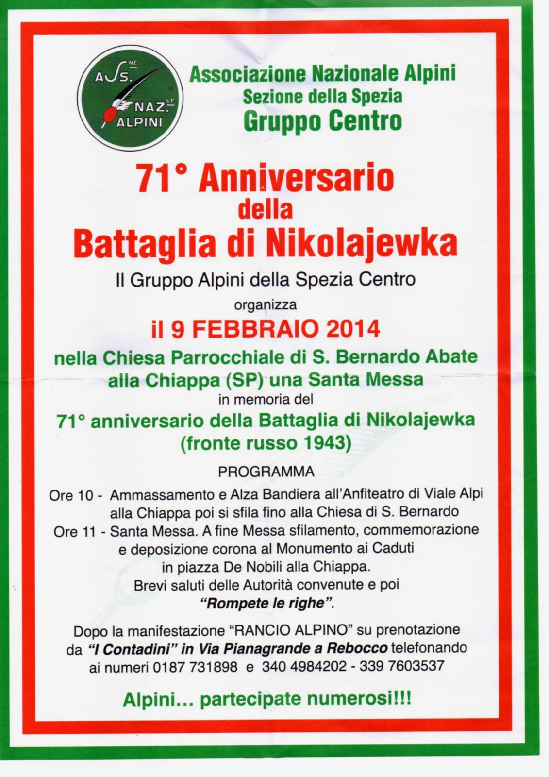 Definito il programma della consueta commemorazione della battaglia di Nikolajewka, che quest'anno si svolgerà il giorno 9 febbraio. La novità è il luogo della manifestazione, che a differenza degli anni scorsi è un quartiere storico della nostra città, ossia alla Chiappa. La decisione assunta dal consiglio direttivo sezionale è finalizzata a rendere l'evento itinerante e non strettamente legato al centro città.