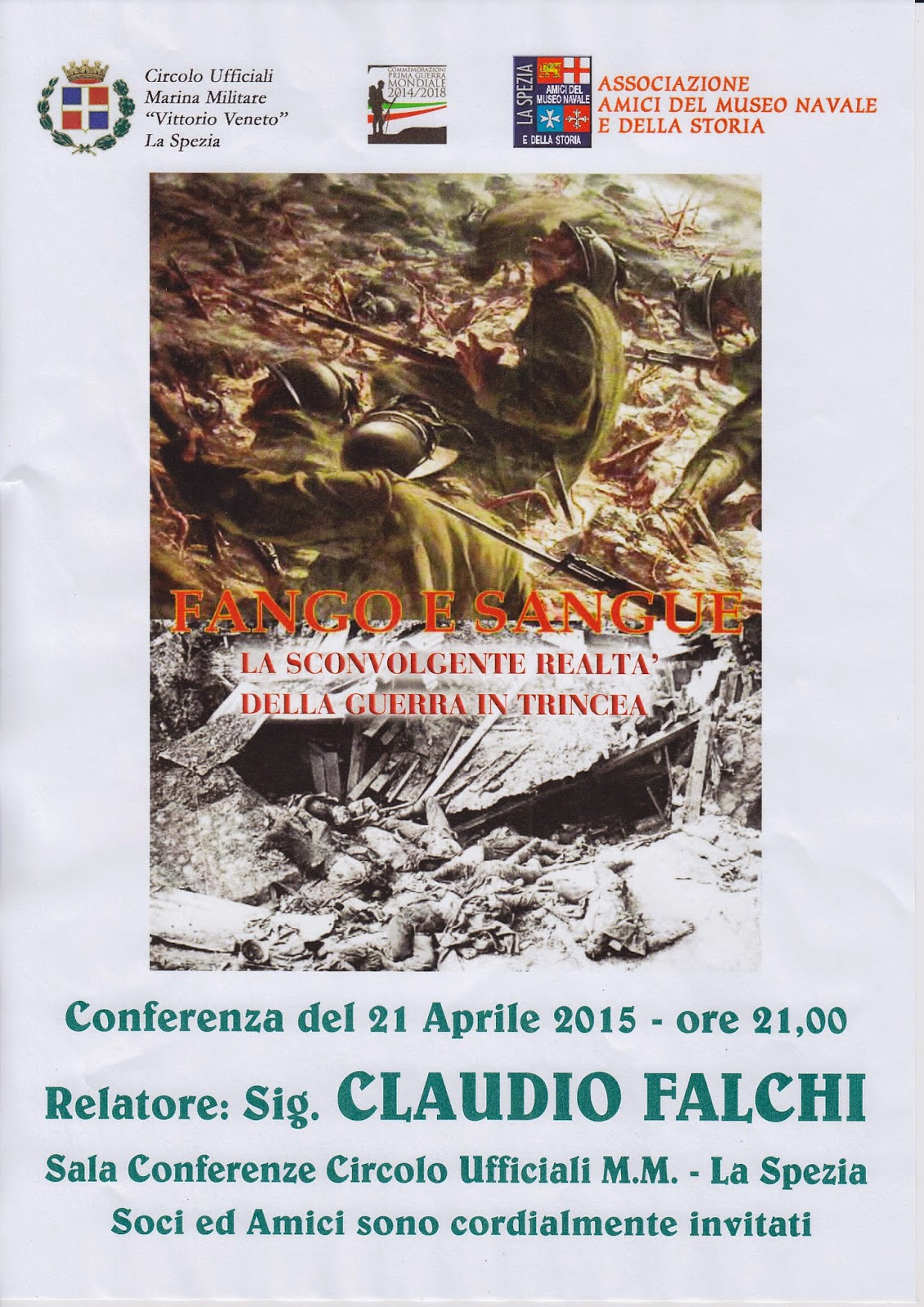 Prosegue la realizzazione del programma annuale d'incontri organizzato dall'associazione Amici del museo navale e della storia. Martedì prossimo 21 aprile, alle ore 21:00, nella sala conferenze del Circolo Ufficiali Vittorio Veneto, il sig. Claudio Falchi, membro del comitato Centanni di Picco, sarà il relatore per la conferenza: "Fango e sangue: la sconvolgente realtà della guerra in trincea". L'incontro rientra nel ciclo delle attività programmate in collaborazione con il Comitato per il Centenario.